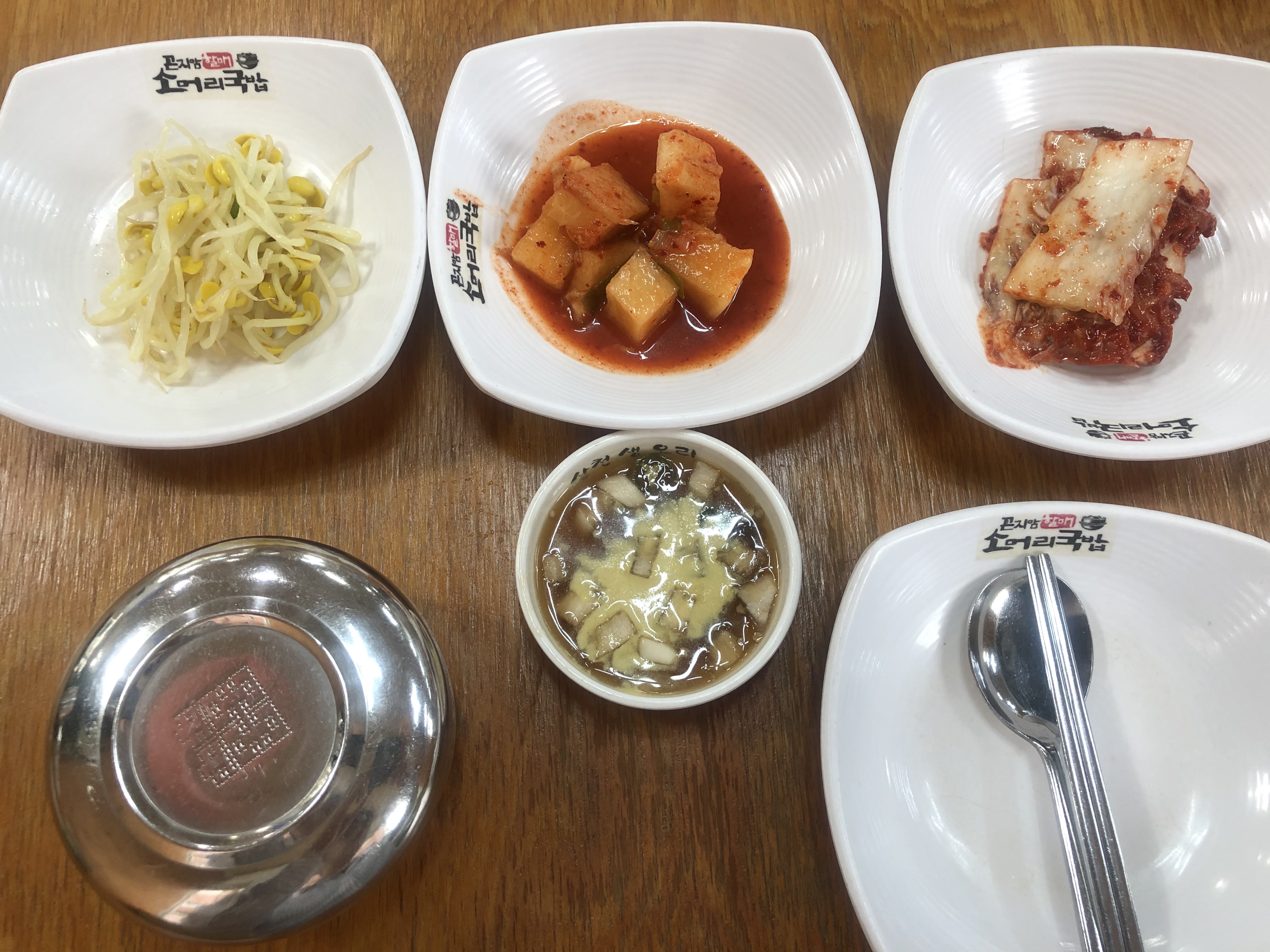 콩나물, 깍두기, 배추김치, 고기 소스가 제공됩니다.